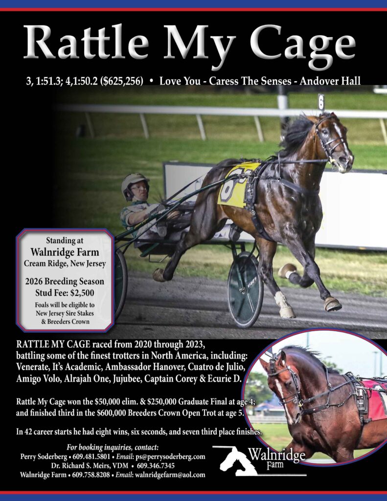 Cream Ridge, NJ – Soderberg Bloodstock LLC is excited to announce that Rattle My Cage 1:50.2 ($625, 256), will race and breed in New Jersey in 2026.